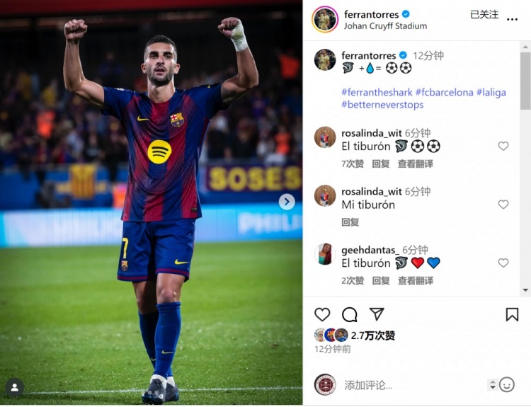 费兰-托雷斯赛后在社交媒体上晒出照片,英超直播在线高清(无插件)庆祝取胜+打进2球,配文:“🦈+💧=⚽️⚽️”
