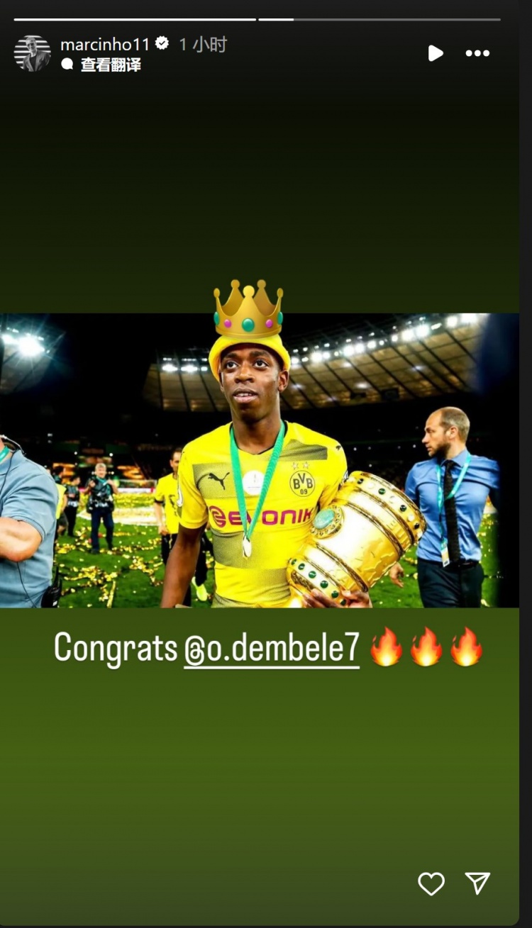 罗伊斯更新社媒动态腾讯意甲新闻,英超免费高清直播晒出登贝莱头戴王冠的PS照片,祝贺前多特队友获奖。