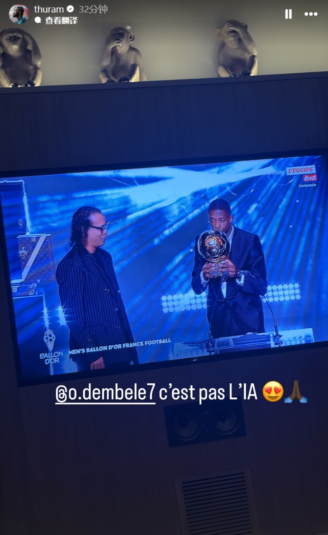 小图拉姆在家看登贝莱获得金球奖,晒照配文:这不是AI生成的😍