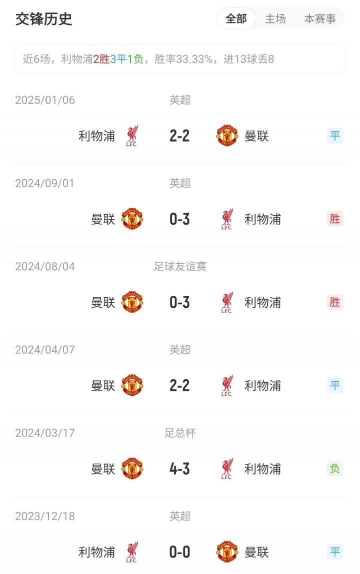目前英超积分榜上,利物浦5胜2负积15分,位列第3;曼联3胜1平3负积10分,位列第11。