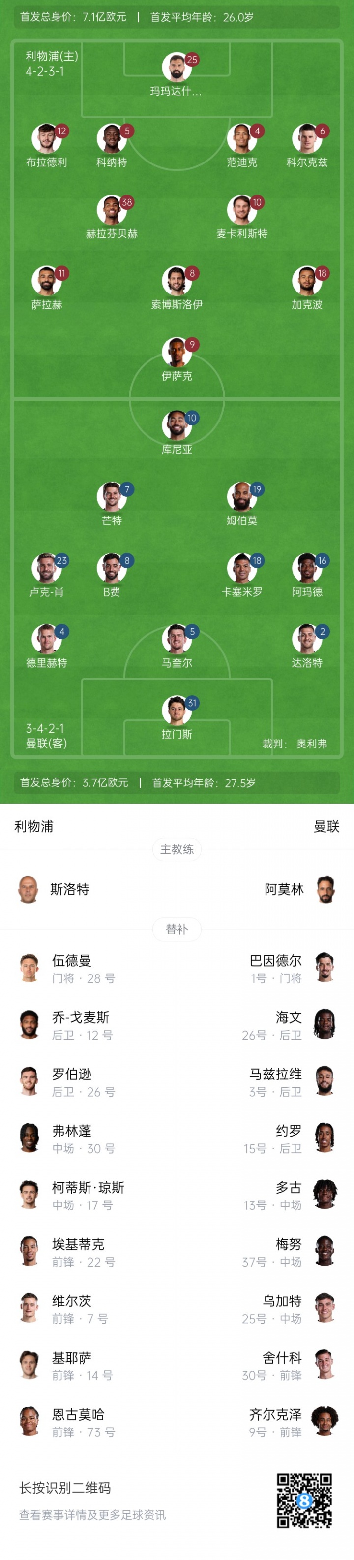 利物浦杆位:25-玛玛达什维利、4-范迪克、5-科纳特、6-科尔克兹、12-布拉德利、8-索博斯洛伊、10-麦卡利斯特、38-赫拉芬贝赫、9-伊萨克、11-萨拉赫、18-加克波