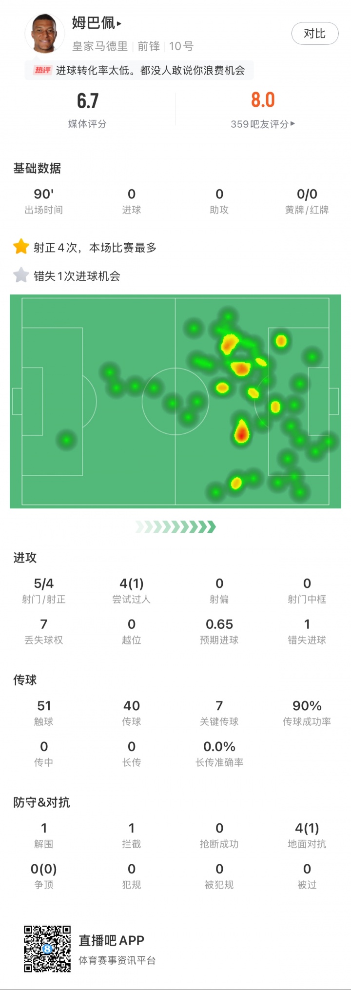 在对阵尤文的赛事 中,姆巴佩打满全场,5次射球 4次射正,错失1次良机,预期得分 0.65。