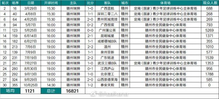 2025中乙职业联赛 赣州瑞狮队现场观赛人群 人数统计:合计16821人次,场均1121人。