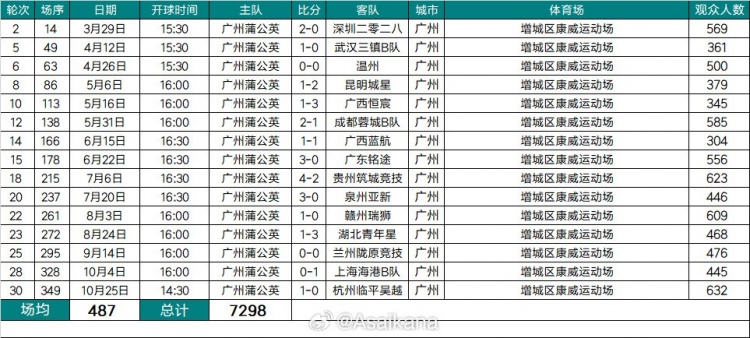 2025中乙职业联赛 广州蒲公英队现场观赛人群 人数统计:合计7298人次,场均487人。