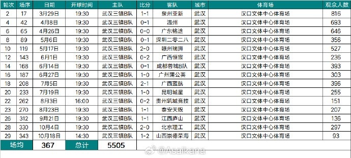 2025中乙职业联赛 武汉三镇B队现场观赛人群 人数统计:合计5505人次,场均367人。