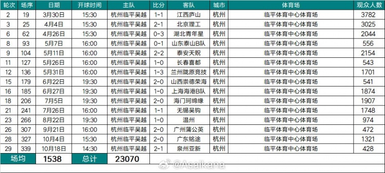 2025中乙职业联赛 杭州临平吴越队现场观赛人群 人数统计:合计23070人次,场均1538人。