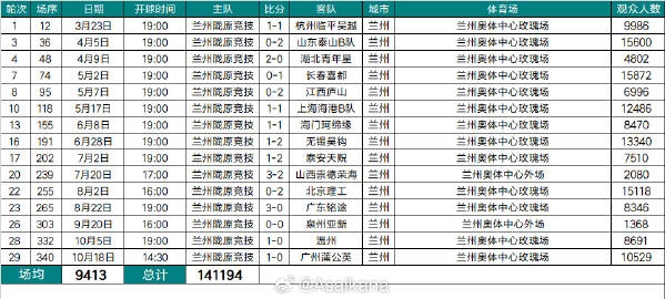 2025中乙职业联赛 兰州陇原竞赛 队现场观赛人群 人数统计:合计141194人次,场均9413人。