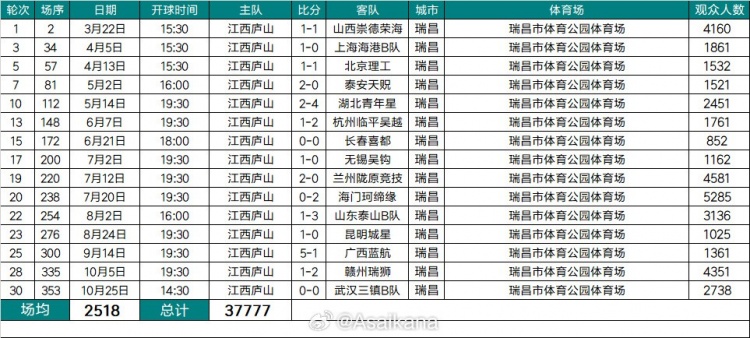 2025中乙职业联赛 江西庐山队现场观赛人群 人数统计:合计37777人次,场均2518人。