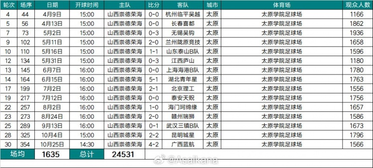 2025中乙职业联赛 山西崇德荣海现场观赛人群 人数统计:合计24531人次,场均1635人。