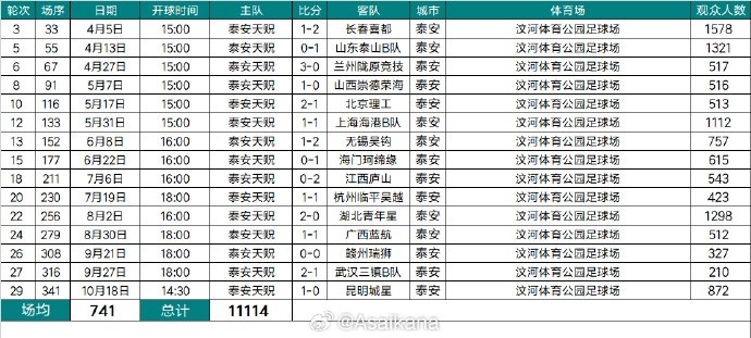 2025中乙职业联赛 泰安天贶队现场观赛人群 人数统计:合计11114人次,场均741人。