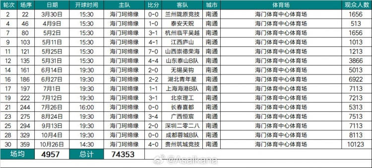 2025中乙职业联赛 海门珂缔缘队现场观赛人群 人数统计:合计74353人次,场均4957人。