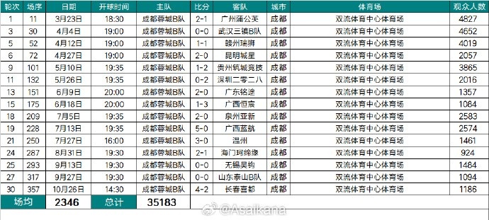 2025中乙职业联赛 成都蓉城B队现场观赛人群 人数统计:合计35183人次,场均2346人。