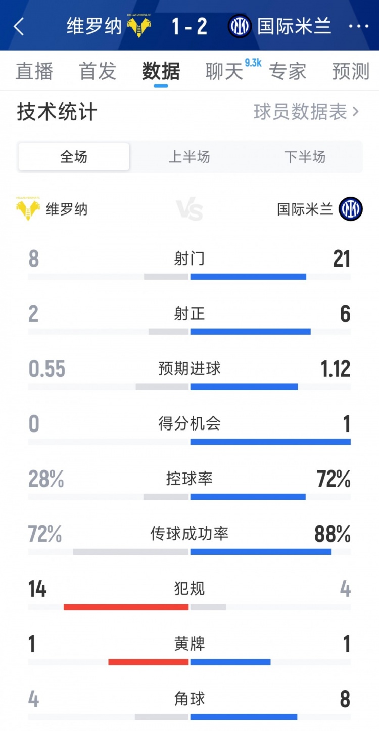 11月2日讯 在本轮意甲,国米2-1险胜维罗纳,英超直播以下为双方全场数据对比: