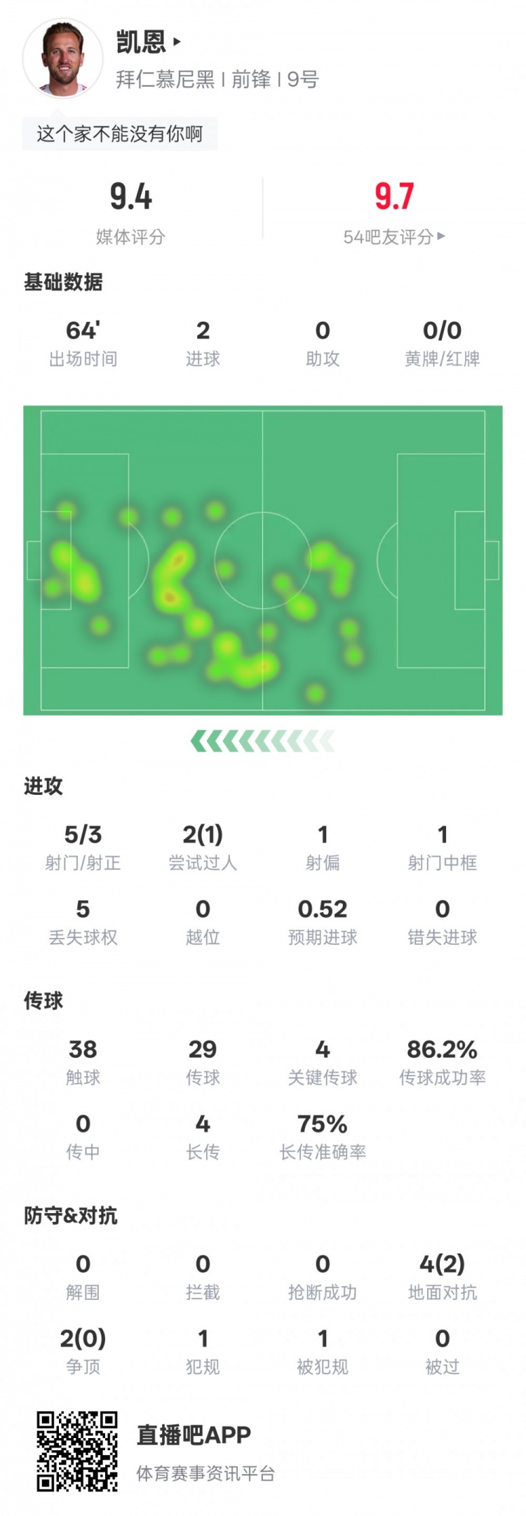 凯恩本场赛事 数据:2得分 4关键传送球 1过人成功1中框,评分9.4
