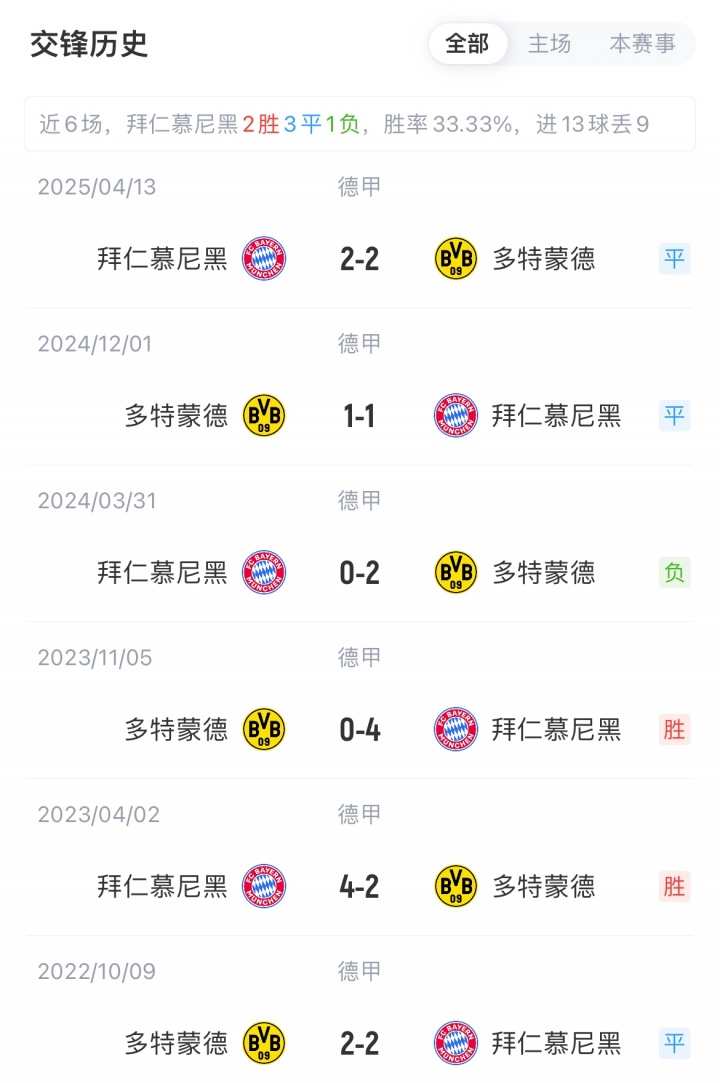 拜仁职业联赛 6轮全胜积18分位居德甲榜首,开季各赛事已获10连胜;多特职业联赛 4胜2平积14分,开季各赛事9场赛事 同样全部保持不败。拜仁对阵多特已3场不胜(2平1负)。