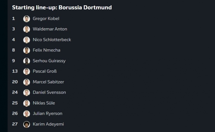 多特蒙德杆位:1-科贝尔、3-安东、4-施洛特贝克、8-恩梅查、9-吉拉西、13-格罗斯、20-萨比策、24-斯文松、25-聚勒、26-莱尔森、27-阿德耶米