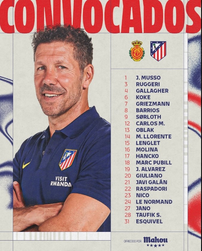 马竞职业联赛 大名单:小蜘蛛复出,格列兹曼、加拉格尔、科克在列
