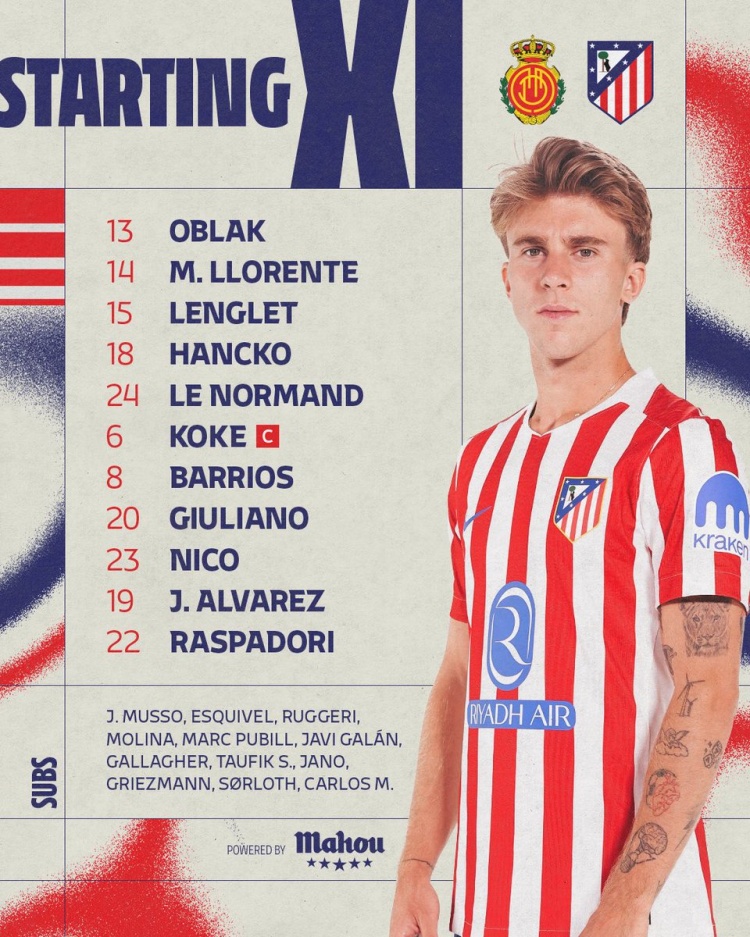马竞杆位:13-奥布拉克、14-马科斯-略伦特、15-朗格莱、18-汉茨科、24-勒诺尔芒、6-科克、8-巴勃罗-巴里奥斯、20-朱利亚诺-西蒙尼、23-尼古拉斯-冈萨雷斯、19-阿尔瓦雷斯、22-拉斯帕多里