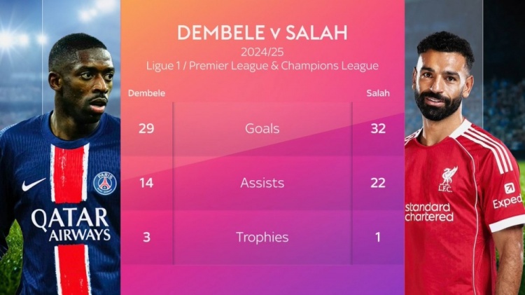 日前,英媒《天空体育》对比了登贝莱、萨拉赫2024/25赛季在职业联赛 和欧冠的数据。
