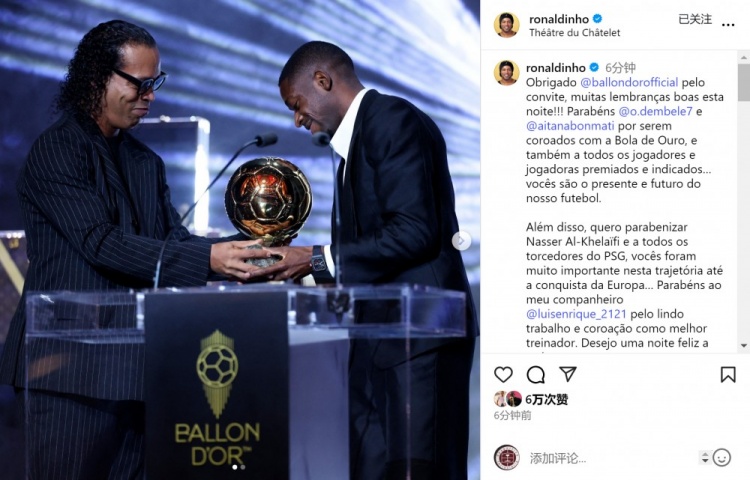 罗纳尔迪尼奥社媒晒出颁奖照片,并写道:“感谢金球奖的邀请,英超直播今晚留下了许多美好的回忆!恭喜登贝莱和邦马蒂荣获金球奖,也祝贺所有获奖和入围的球员们……你们是古代足球 的现在和未来。”