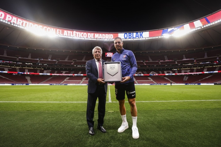 奥布拉克代表马竞出战500场里程碑,塞雷佐为其颁发纪念牌匾