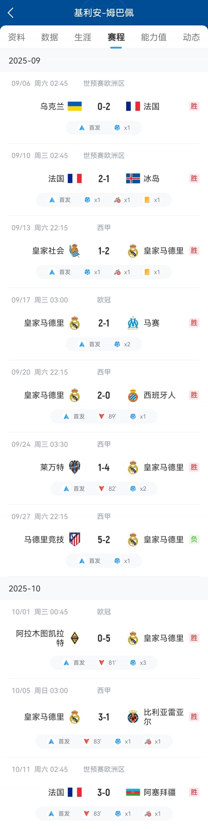 从9月开始的10场赛事 中,姆巴佩场场先发,在职业联赛 +欧冠+国家队狂轰15个得分 和4个助功 ,英超直播领跑西甲和欧冠射手榜。姆巴佩出战+破门的这10场赛事 中,皇马仅输1场,法国队则保持不败。