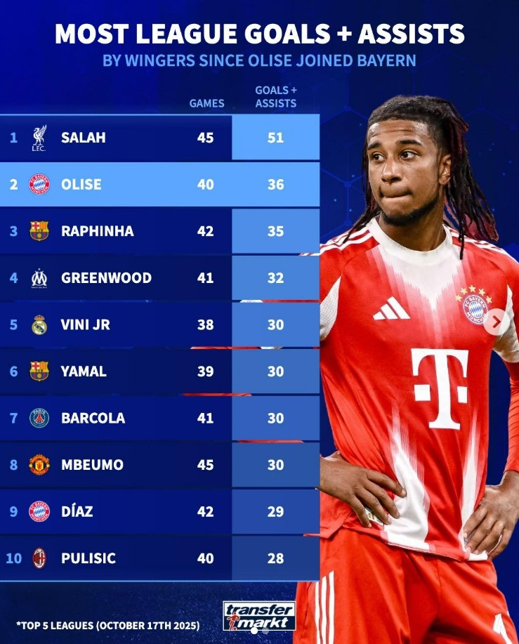 自奥利塞加盟拜仁职业联赛 直接加入 36球,翼锋位置同期仅次于萨拉赫