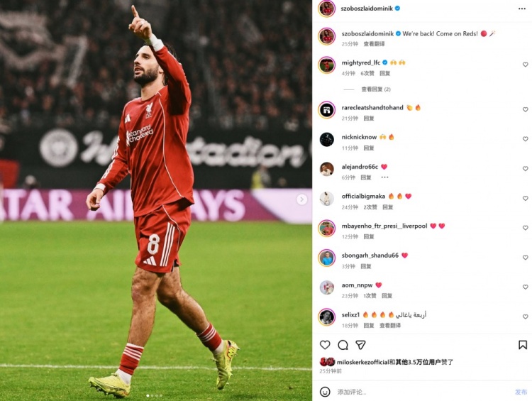 本场赛事 索博斯洛伊传射建功直播 欧冠,英超直播帮助球队终结4连败颓势。赛后索博斯洛伊在社媒晒照写道:“我们回来了!红军助威 !”
