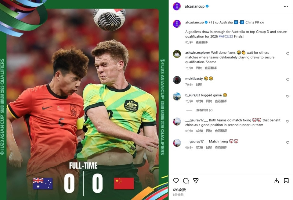 赛后,知名博主斯文已逝吐槽道:“澳大利亚最后这段演都不演了,直接本方半场倒脚。双方利益最大化的0-0,一切尽在不言中了。”