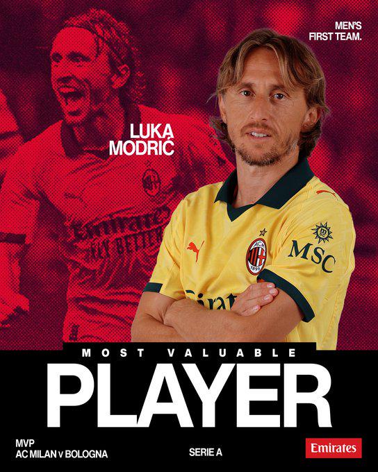 AC米兰官方:莫德里奇打进意甲生涯首球并当选最有价值球员