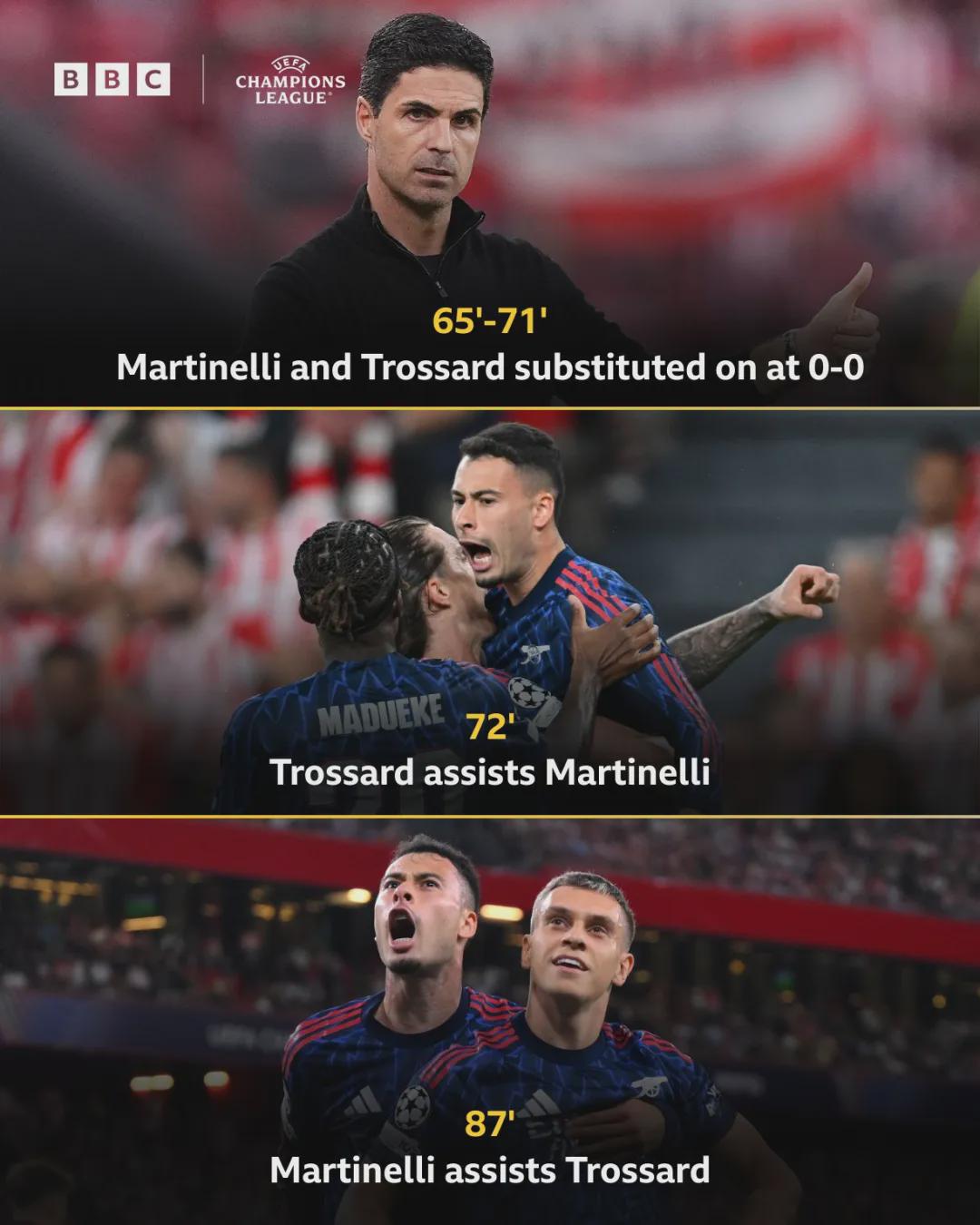 此役,阿尔特塔的球队在客场应战 遭到了主队压制,他们在大部分时间内都难以制造绝对机会。直到第72分钟,夏窗新援约克雷斯与埃泽先后被换下,仅后备 登场36秒的马丁内利便接到特罗萨德过顶挑传利用速度形成单刀赴会,帮助阿森纳1-0打破僵局。