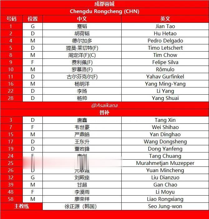 好在成都蓉城选择硬刚韩国第一名 球队,根据名单显示。