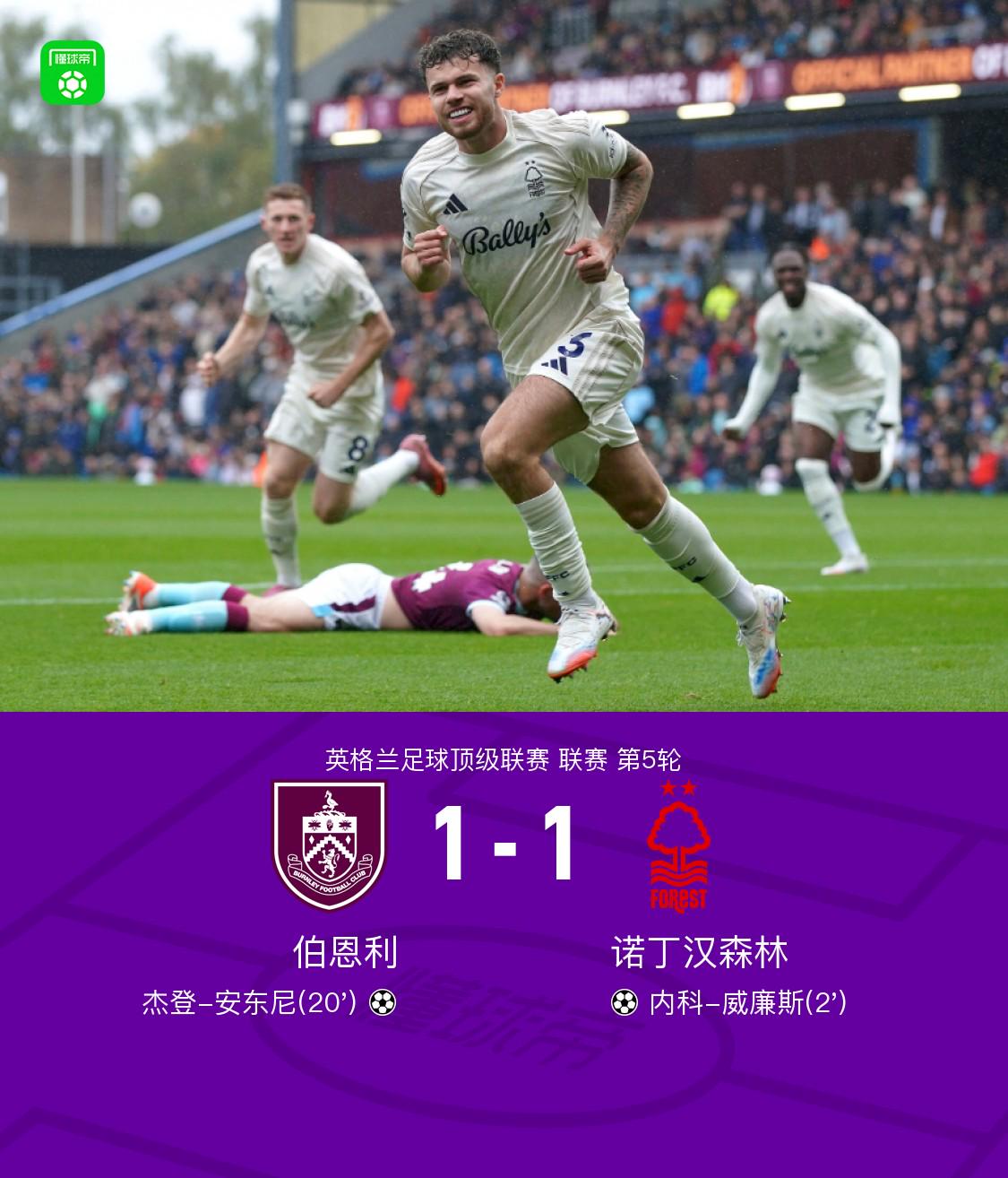 北京时间9月20日足球新闻网易,英超职业联赛 第5轮展开角逐,伯恩利坐镇主场作战 迎战诺丁汉森林。赛事 伊始,诺丁汉森林快速 打破僵局,内科-威廉斯攻入一球,为客队取得领跑 。此后伯恩利加强攻势,并在随后的赛事 中由福斯特送出精准助功 ,杰登-安东尼扳平比分。杜布拉夫卡屡献神扑。双方均未能再度改写比分,最终1-1握手言和。
