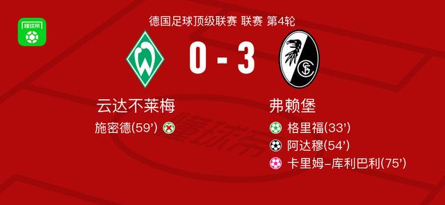 北京时间9月20日德国古代足球 顶级职业联赛 职业联赛 第4轮足球新闻发布会,云达不莱梅主场作战 对阵弗赖堡。云达不莱梅卡里姆-库利巴利乌龙球。弗赖堡格里福破门,阿达穆破门。最终比分云达不莱梅 0-3 弗赖堡。