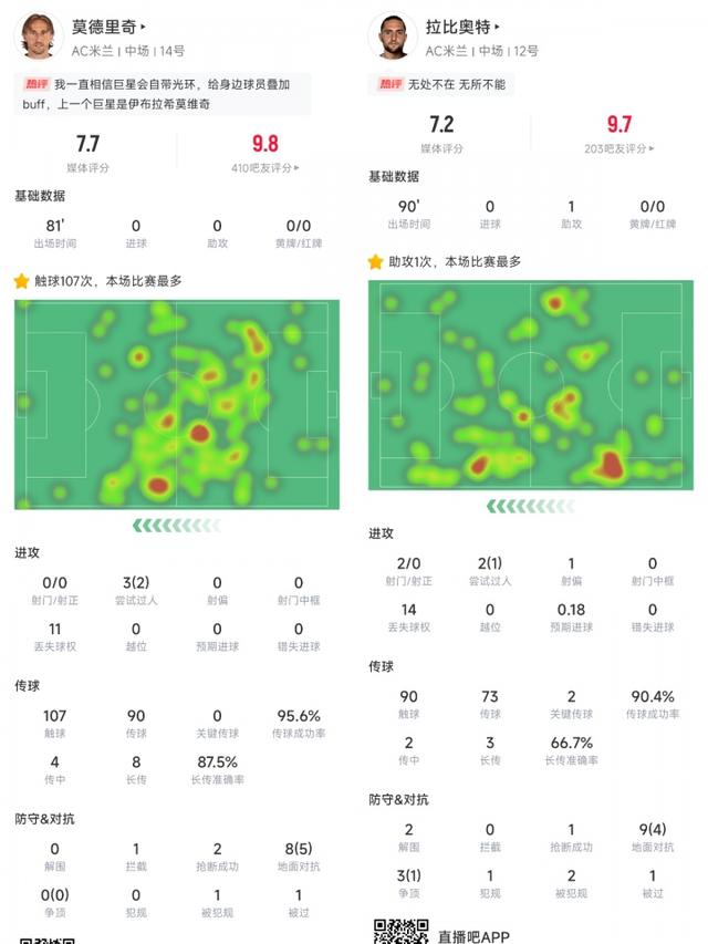 本场赛事 米兰中场球员双核和莫德里奇表现出色,拉比奥特全场完成90次触球,73次传送球 并送出1次助功 ,传送球 成功率90.4%;莫德里奇更是完成了全场最高的107次触球,英超免费高清直播以高达95.6%的成功率送出了90次传送球 。