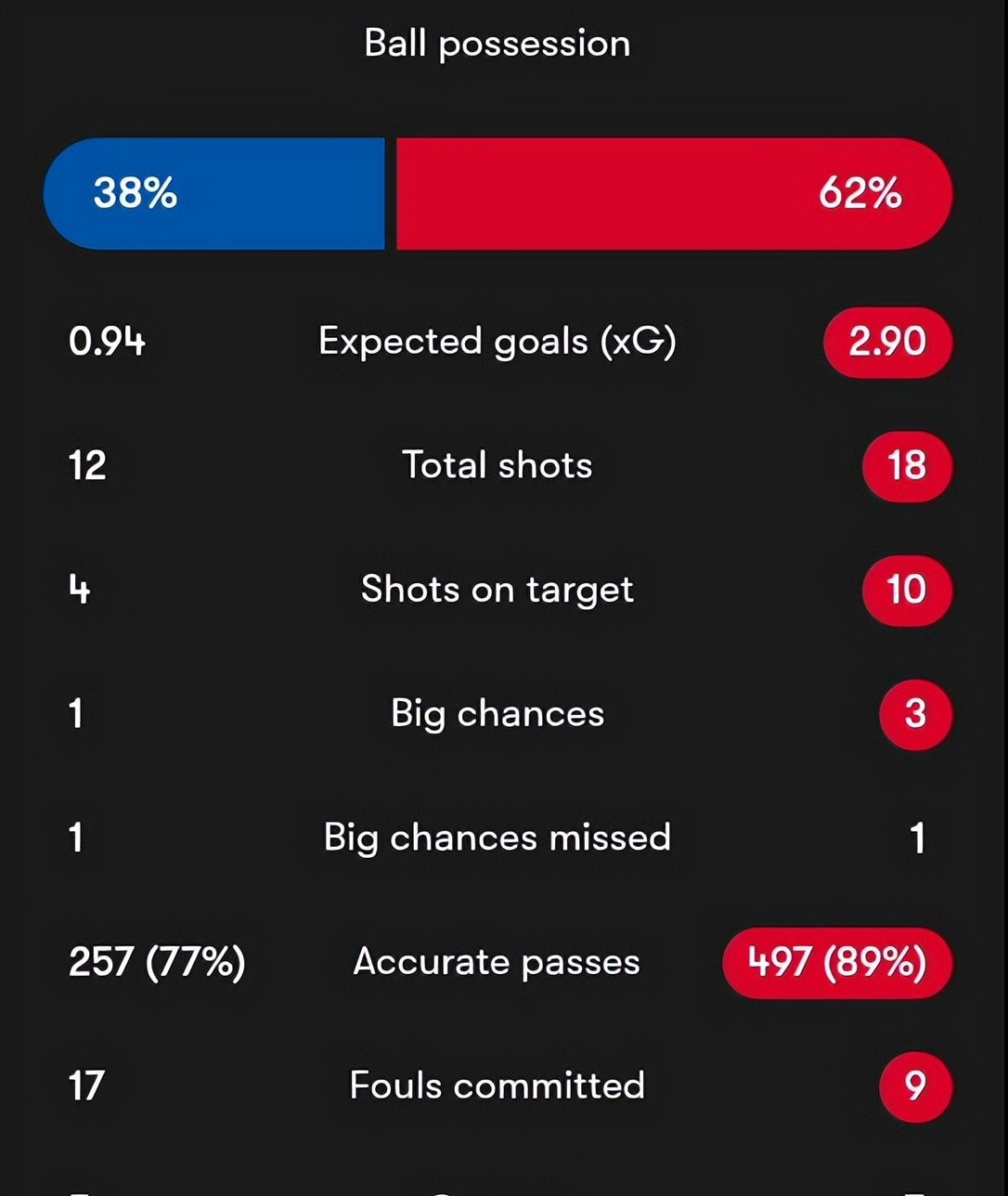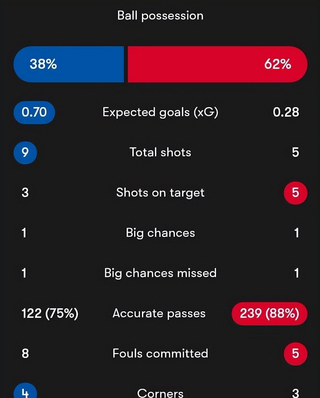 正因此,当全场数据的统计到来之后,拜仁的预期得分 也从半场的0.28来到了2.9,射球 也从上半场的5次来到了最终的18次,比分也从半场看似胶着的0-1变成了实力差距明显的1-4;