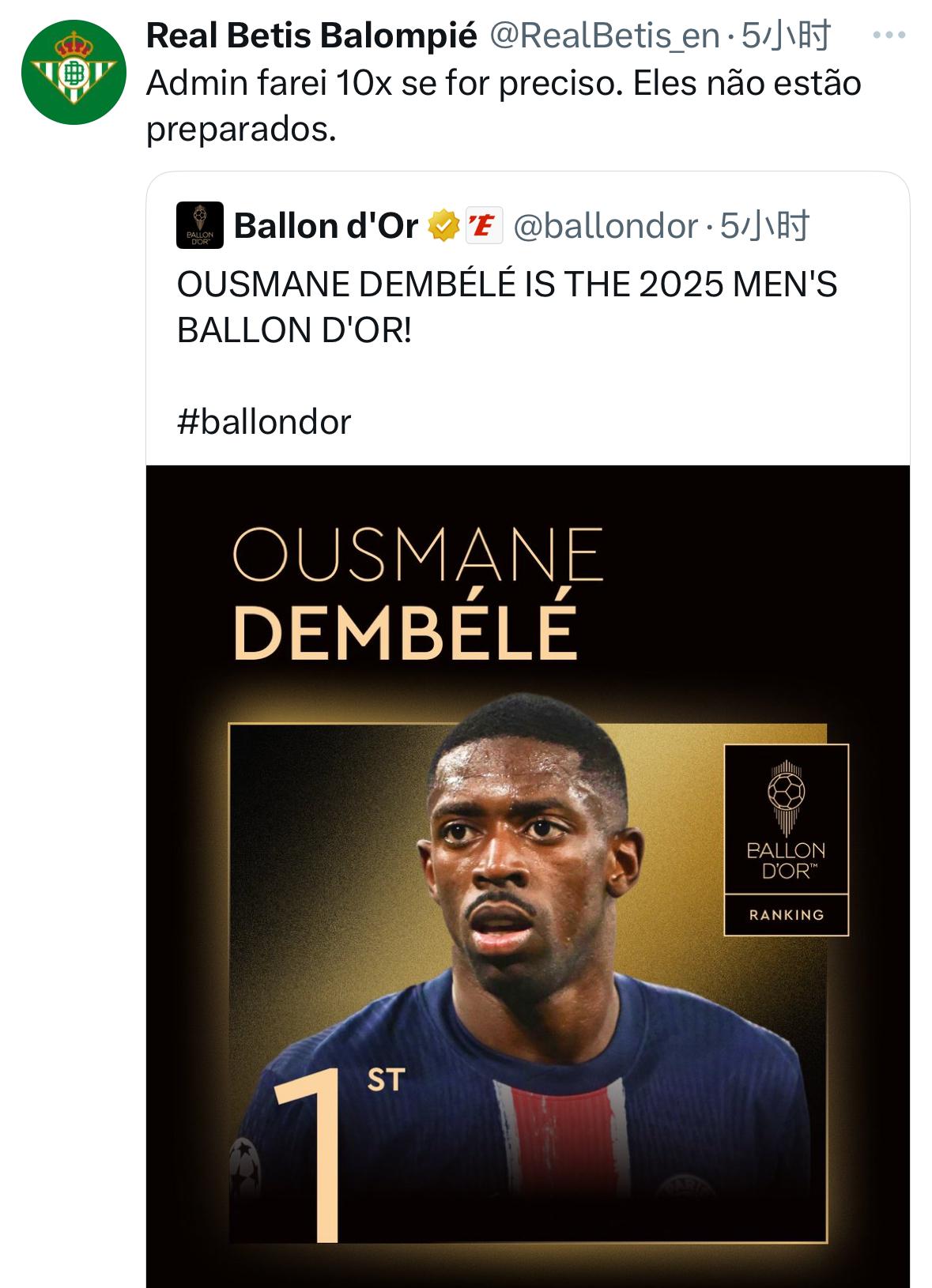 而在登贝莱获得本届金球奖后,英超直播在线高清(无插件)皇家贝蒂斯官方社媒转发了登贝莱获奖的消息并配文写道:“如果有必要,我会发10遍,他们还没准备好。”显然,这句话是在影射去年维尼修斯的相关言论。