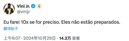 去年无缘金球奖后,维尼修斯曾在个人社媒表示:“如果有必要,我会付出10倍努力,他们还没有准备好。”