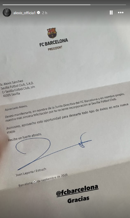 巴萨致信桑切斯:祝贺你加盟塞维利亚,祝愿你取得成功