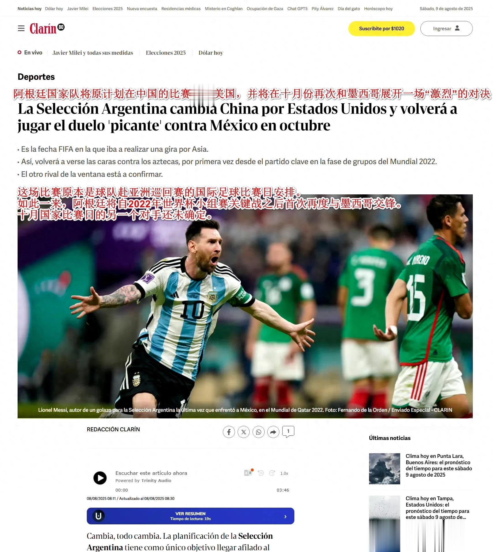 阿根廷《号角报》原文标题:阿根廷国家队将原计划在中国的赛事 改在美国足球最新动态,并将在十月份再次和墨西哥展开一场“剧烈 ”的对决