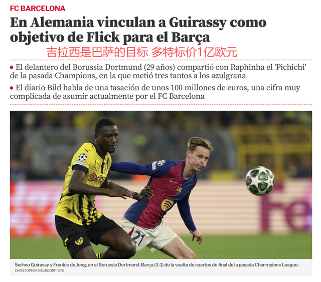 《图片报》指出,巴萨主帅弗里克非常欣赏吉拉西。29岁的吉拉西,是2024-25赛季欧冠金靴(打进13球,与拉菲尼亚并列)。吉拉西身高1米87,身体素质出色,擅长反击中的冲刺跑 、反跑。去年夏天,吉拉西以1800万欧元加盟多特,1年多来56场赛事 打进43球,效率极高。