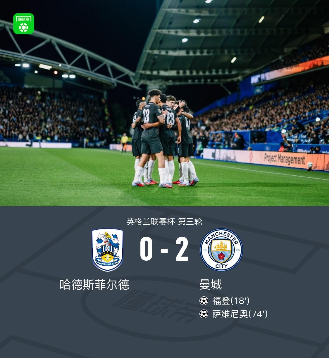曼城客场应战 2-0哈德斯菲尔德晋级下一轮 ,福登传射建功,萨维尼奥破门