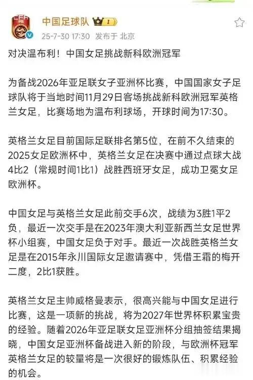 米利西奇主指导教练员找到了女足进步 正确的方向,他决定在接下来一个女足亚洲杯的准备比赛 周期,安排一场和英格兰女足的赛前热身 赛,赛事 将定在11月29日,时间充裕,还有两三个月。