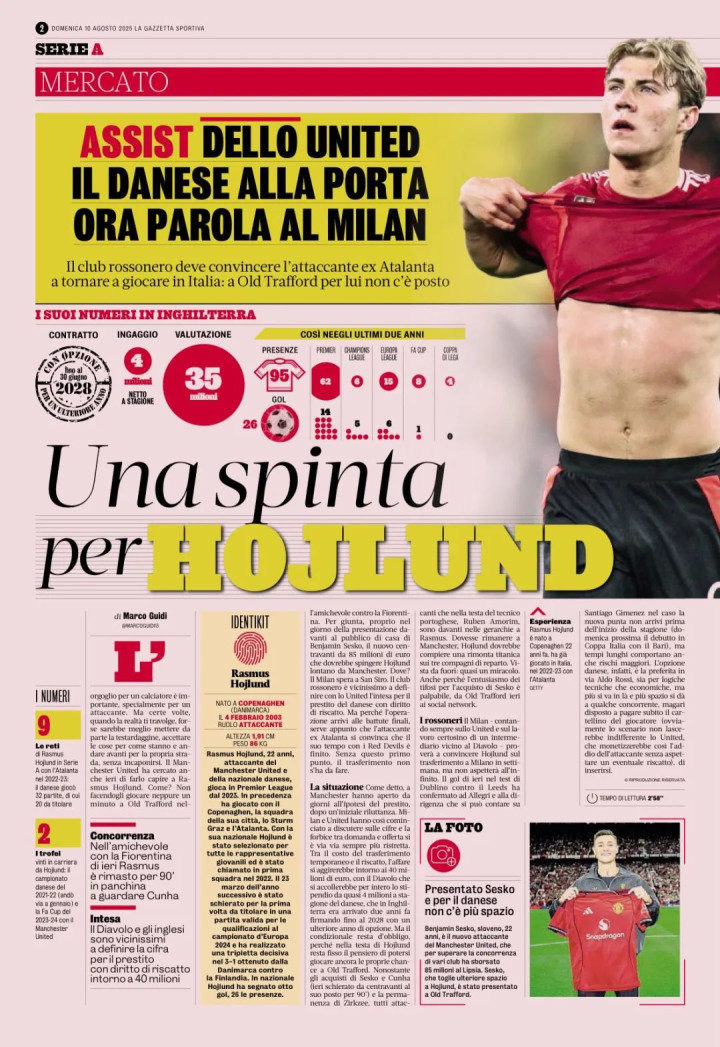 霍伊伦德在2023年以7500万欧元转会费从亚特兰大加盟,还有1000万欧元的浮动条款,他签约5年,目前还有3年的合同。他被认为已经不情愿地接受了自己不得不离开的现实,米兰现在有机会说服他加盟。