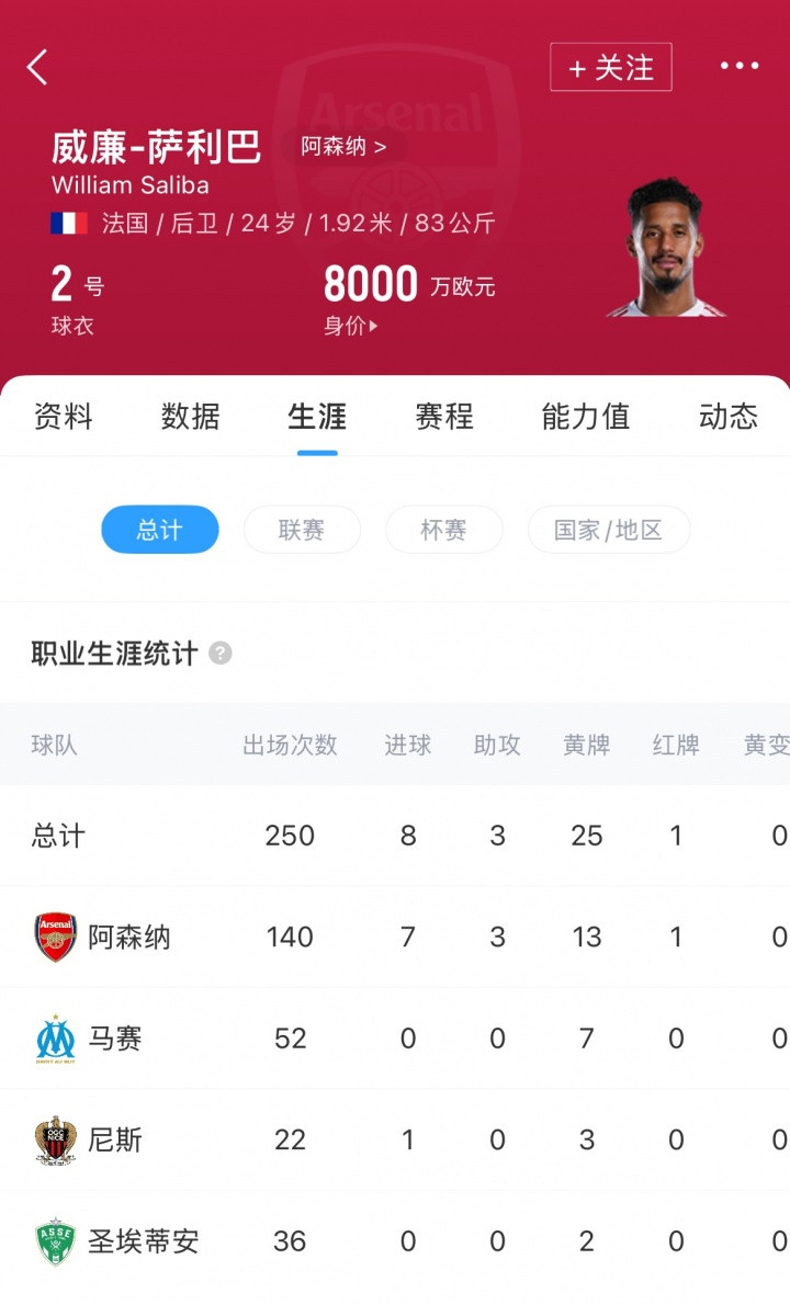 至今萨利巴已经代表阿森纳一线队出场140次,贡献过7球3助功 。国家队层面萨利巴为法国队出场28次。目前萨利巴的德回转 价已经达到8000万欧元。