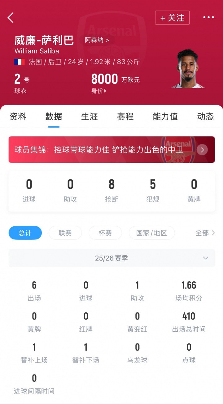 直到2022年8月,已经被阿森纳签下3年的萨利巴才在阿尔特塔的执教下迎来首秀,此后的他发挥稳定,逐渐成长为英超以及欧洲范围内优秀的中卫代表。