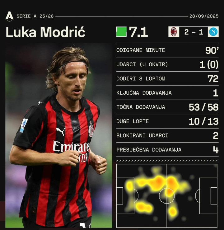 登陆意甲仅两个月,莫德里奇便征服了媒体、球迷和对手。在对阵那不勒斯的赛事 中,莫德里奇跑了11.094公里,成为了场上移动距离 第二多的球员(仅次于队友拉比奥特)。就在德布劳内因为怠于跑动而遭到孔蒂批评的时候,莫德里奇以40岁的年龄成为了意甲榜样。