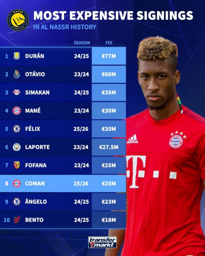 利雅得获胜 最贵引援榜: 杜兰7700万欧居首, 科曼2500万欧并列第7