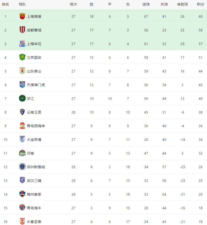 在积分榜上,上海海港以60分排名榜首。成都蓉城紧随其后,拿到58分。上海申花以57分排名第3。第一名 的争夺还是非常剧烈 。虽然上海海港占据优势,但接下来的赛事 不容有失,一旦丢分很可能就被挤下去。而保级形势也是比较乱。深圳新鹏城26分基本保级成功。武汉三镇25分排名第13。梅州客家拿到20分,排名倒数第3。长春亚泰以19分排名倒数第2。倒数第1的是青岛海牛,少踢1场,拿到18分。