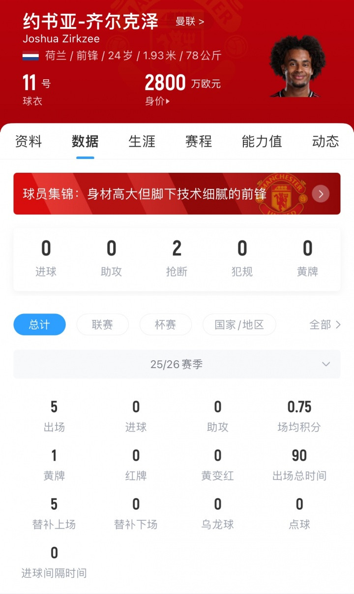 齐尔克泽去年夏窗以4250万欧转会费加盟曼联,本赛季0球0助,目前德回转 价2800万欧。